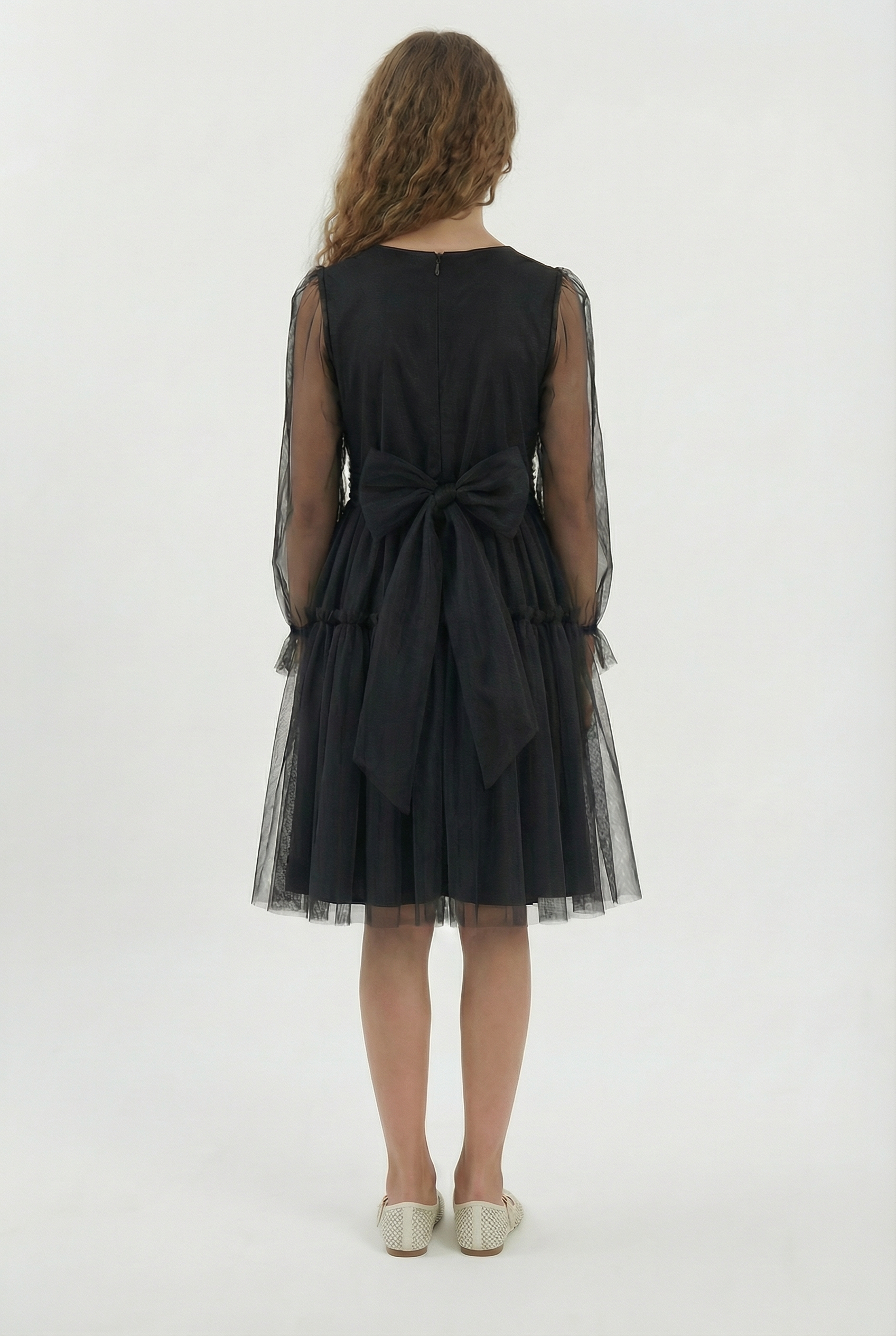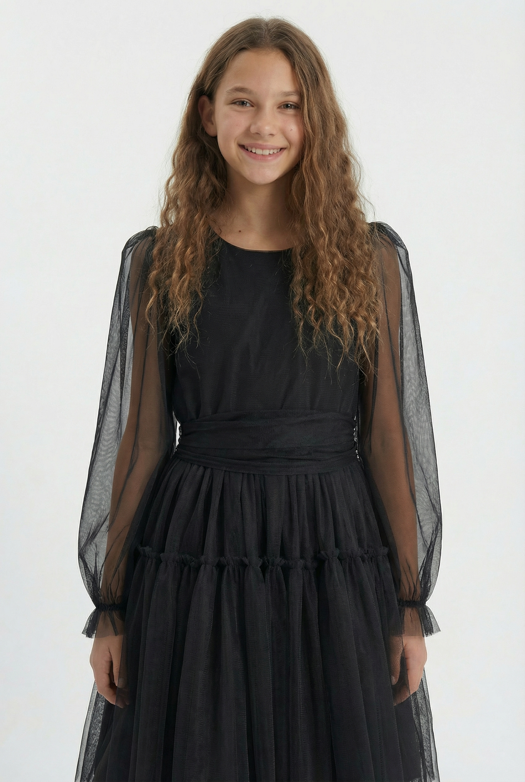 Šaty Holly v elegantní černé jsou ztělesněním moderní dětské módy, která spojuje pohodlí s okouzlujícím vzhledem. Jemný tyl překrývající bavlněnou podšívku vytváří vzdušnou a romantickou siluetu, zatímco dlouhé rukávy dodávají šatům sofistikovaný charakter vhodný i pro chladnější měsíce. Tylový pásek v pase podtrhuje štíhlou linii a dodává celkovému vzhledu nádech luxusu.