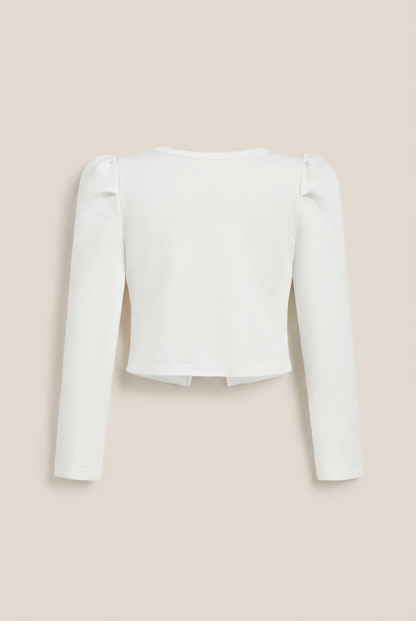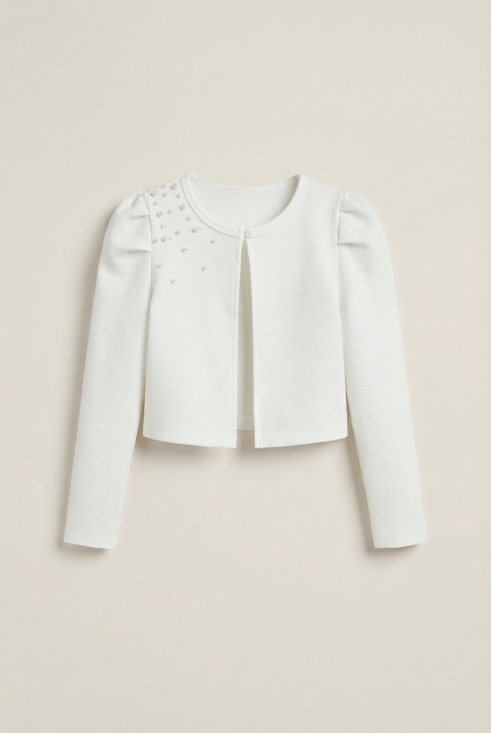 Shrnuto, toto bolerko není jen praktickým doplňkem k oblečení, ale také prvkem, který při každé zvláštní příležitosti zvýrazní mladou dámu. Jeho klasický střih a krémová barva usnadňují kombinování s různými styly, přičemž zajišťují pohodlí a eleganci.