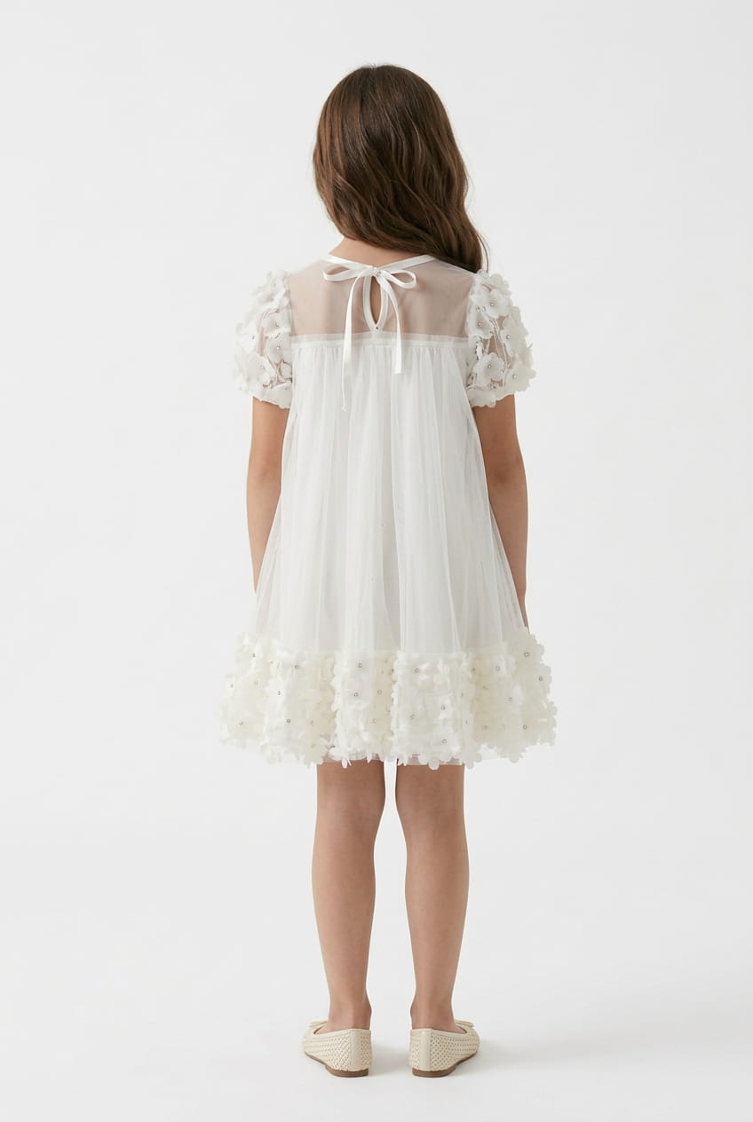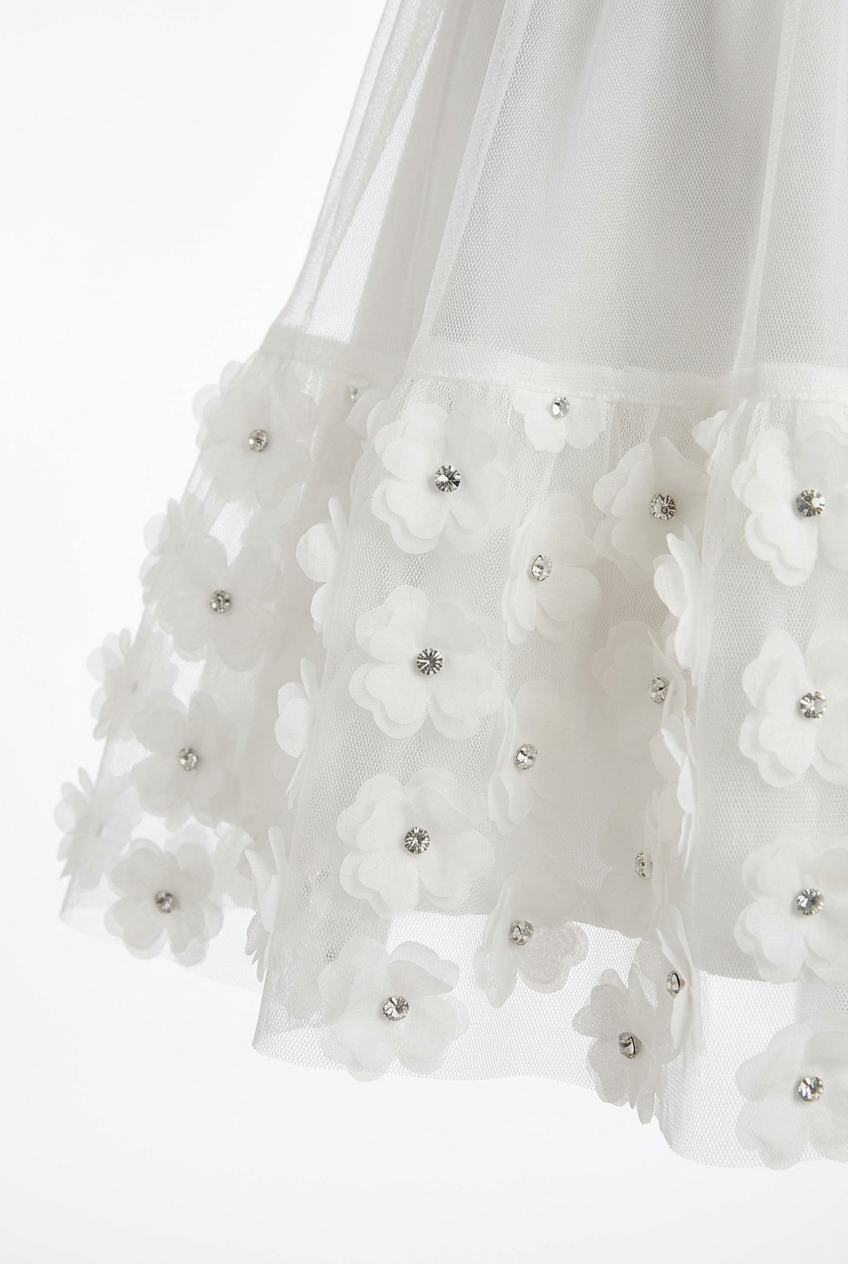 Představte si okamžik, kdy Vaše dcerka vstoupí do místnosti a všechny pohledy se obrátí jejím směrem. Šaty Romy v jemné krémově bílé barvě jsou ztělesněním dětské elegance, která promění každou slavnostní příležitost v nezapomenutelný zážitek. Vzdušný tyl zdobený nádhernými 3D květinami dodává šatům pohádkový charakter, zatímco pohodlná podšívka zajišťuje celodenní komfort i pro ty nejaktivnější malé princezny.