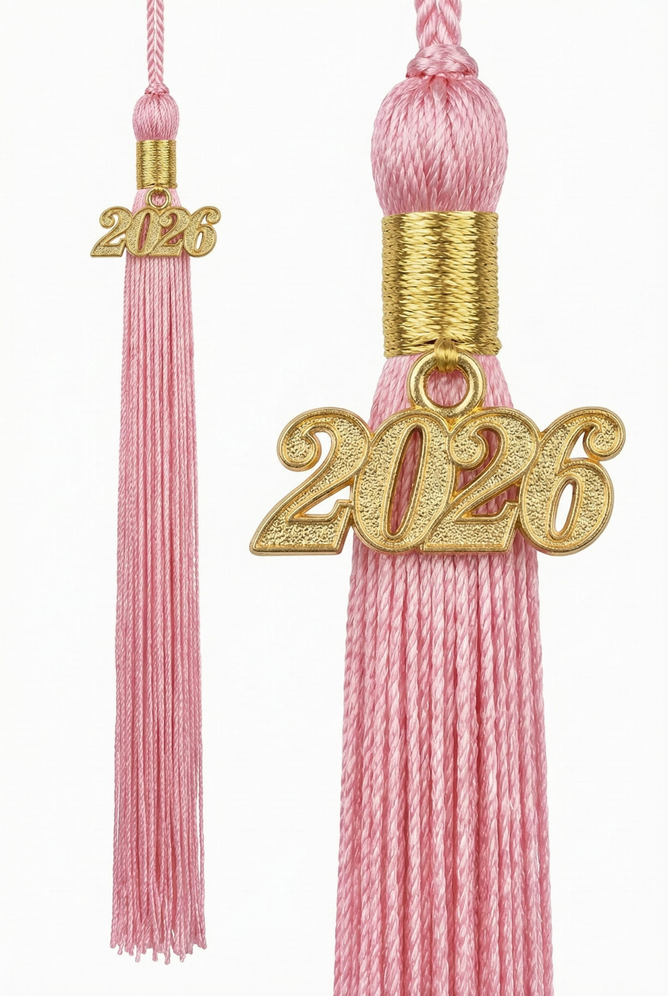 Třásně z běžného roku – Součástí čepice je ozdobná růžová třáseň se zlatým přívěskem s rokem ukončení studia, který symbolizuje ukončení studia a dodává čepici jedinečný charakter.